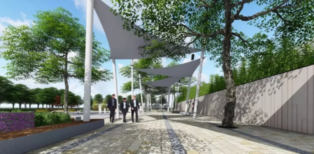 濱江長廊分為三個功能區(qū)域。其一,總長達600米的濱江走廊,具備徒步健身等基本功能,沿途貼心設置了多個休息座椅,走廊內(nèi)側(cè)由色彩斑斕的植物組成灌木帶,在這里即可健身賞景,也可小憩一番,感受慢生活的從容與智慧;其二,沿江修建親水平臺,在平臺上俯身即可觸及水面,階梯式的觀景平臺,能為游客提供多視角的觀江體驗。其三,文化廣場設立了噴泉、文化墻、揚帆之路等多個景點,滿足群眾各類集聚娛樂或文化活動的場地需求,當夏夜來臨之時,伴隨著蟬鳴之聲,別有一番情調(diào)。